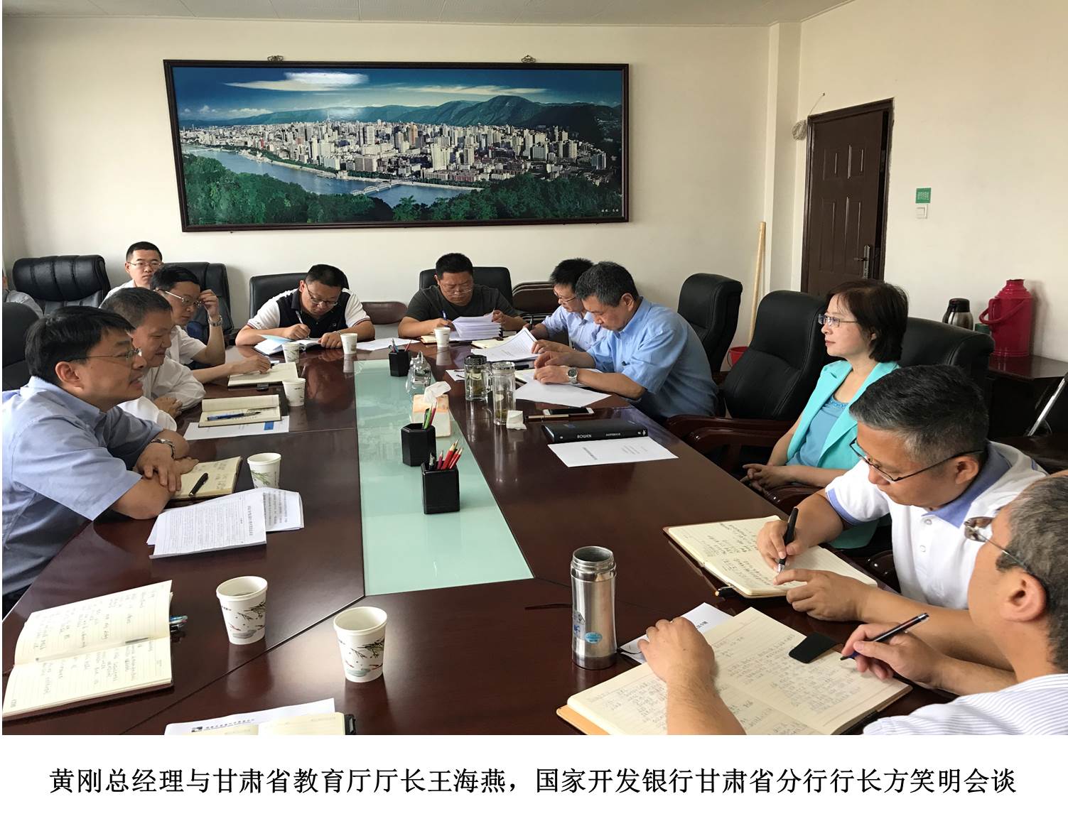 8月8日-10日,為落實(shí)在全國打贏(yíng)教育脫貧攻堅現場(chǎng)會(huì )簽署的助力甘肅教育脫貧協(xié)議,黃剛總經(jīng)理一行3人赴甘肅臨洮縣、武威市實(shí)地考察教育扶貧PPP項目,并與當地主要領(lǐng)導座談。