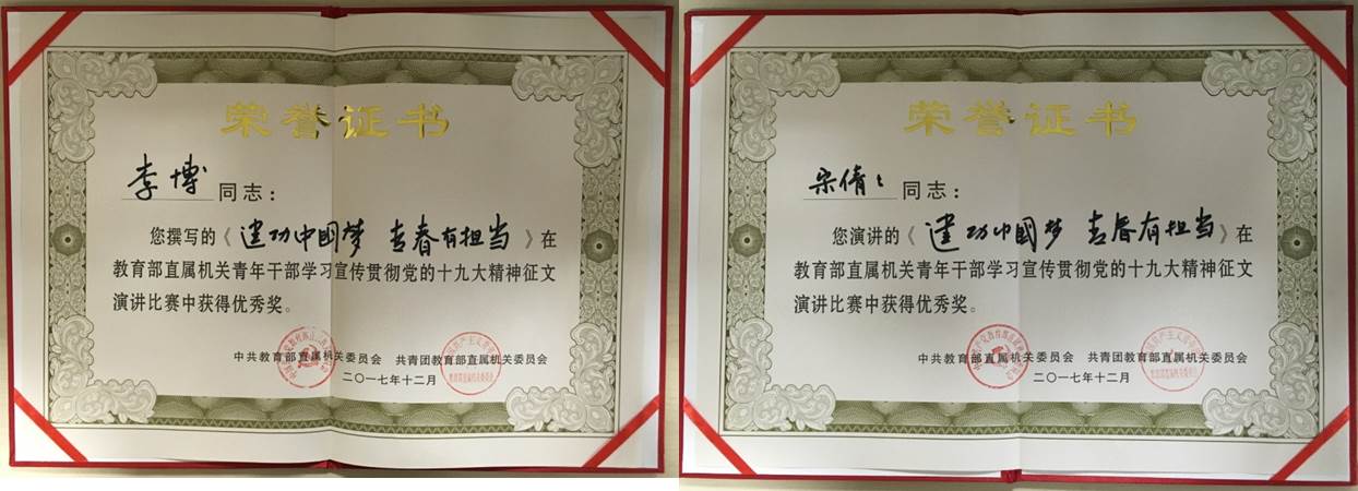 2017年12月13日,教育部舉辦直屬機關(guān)青年干部學(xué)習宣傳貫徹黨的十九大精神征文演講比賽,我公司團支部選送由李博撰寫(xiě)、宋倩倩演講的《建功中國夢(mèng) 青春有擔當》參加比賽,榮獲優(yōu)秀獎。