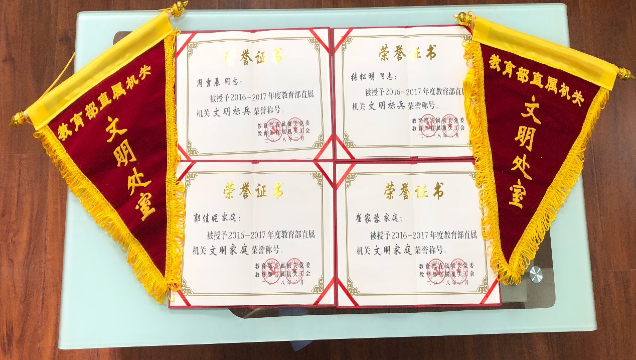 為認真學(xué)習貫徹黨的十九大精神,進(jìn)一步夯實(shí)直屬機關(guān)精神文明創(chuàng )建載體,切實(shí)引導廣大干部職工講文明、樹(shù)新風(fēng),愛(ài)崗敬業(yè)、履職盡責,教育部直屬機關(guān)黨委、直屬機關(guān)工會(huì )組織開(kāi)展了2016-2017年度直屬機關(guān)文明處室、文明標兵和文明家庭評選活動(dòng)。經(jīng)評選,我公司進(jìn)口部、招標部被評為“教育部直屬機關(guān)文明處室”榮譽(yù)稱(chēng)號;戰略合作部周雪辰、行政部張松明被授予“教育部直屬機關(guān)文明標兵”榮譽(yù)稱(chēng)號;網(wǎng)絡(luò )部郭佳妮、計財部崔家蓉被授予“教育部直屬機關(guān)文明家庭”榮譽(yù)稱(chēng)號。