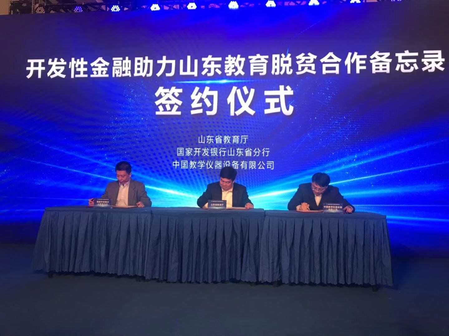 2018年12月11日,中國教學(xué)儀器設備有限公司與山東省教育廳、國家開(kāi)發(fā)銀行山東分行在青島共同簽訂了開(kāi)發(fā)性金融助力山東教育脫貧合作備忘錄。三方將堅持精準扶貧、精準脫貧的基本方略,以補齊教育短板為重點(diǎn),精準對接教育扶貧多元化需求,共同推進(jìn)山東教育脫貧攻堅工作。